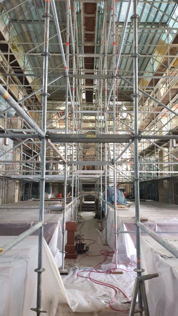 Die Arbeiten zur Restaurierung unserer Pfarrkirche zum Hl. Georg sind seit Anfang Juli im vollen Gange. Hauptanliegen dabei ist die Säuberung der Innenwände, Gewölbe und Fresken von den Verschmutzungen, die sich seit der letzten großen Restaurierung im Jahr 1993 als Gemisch von Ruß und Staub an den feucht-kalten Gemäuern angesammelt haben.